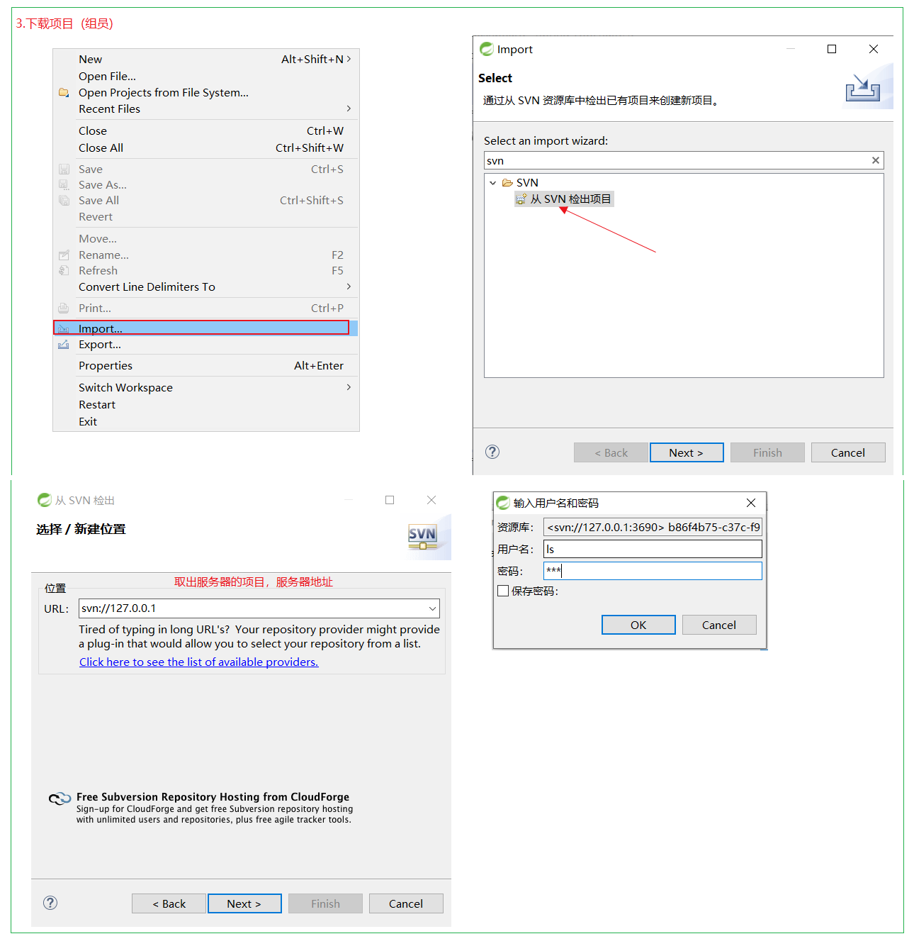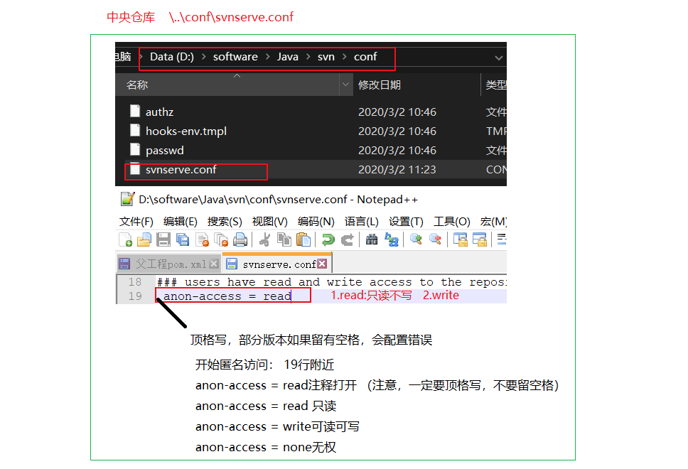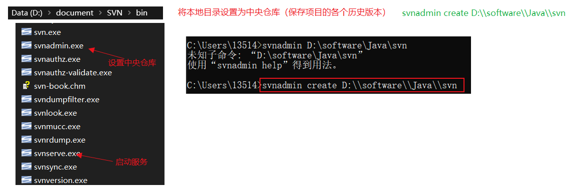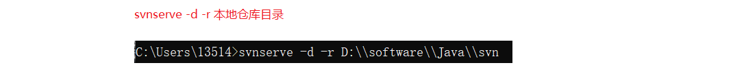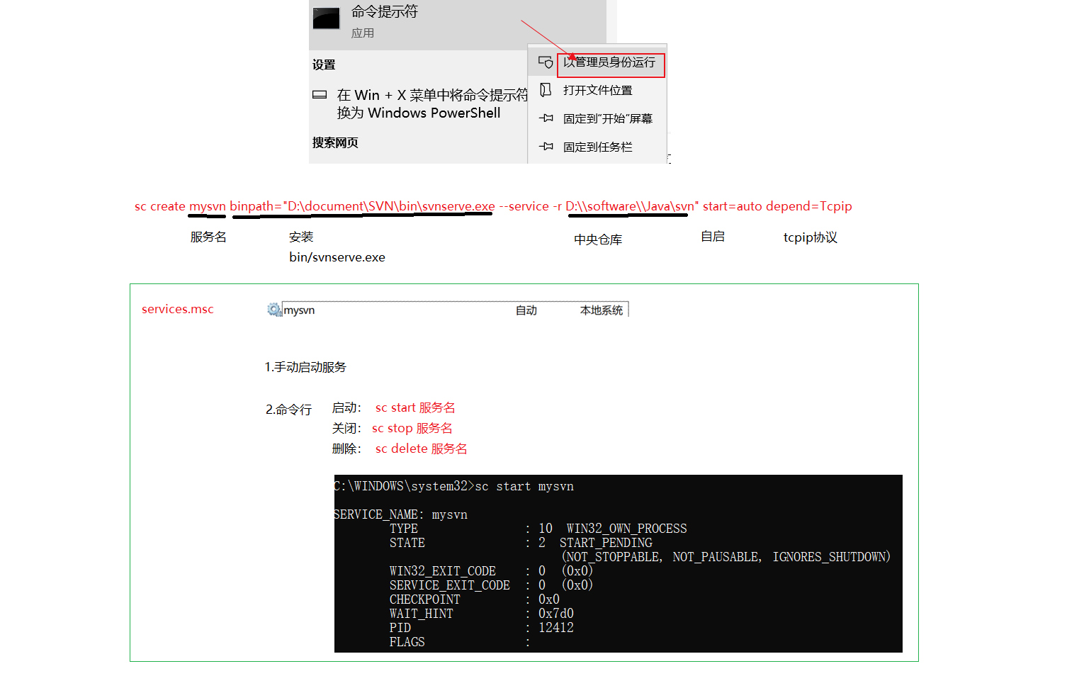 sc create mysvn binpath="D:\document\SVN\bin\svnserve.exe --service -r D:\\software\\Java\svn" start=auto depend=Tcpip
