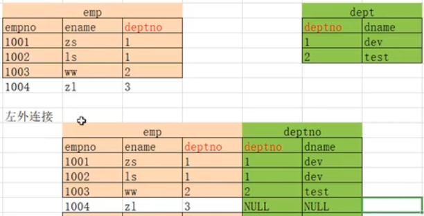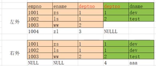 左外连接 LEFT OUTER JOIN, 以左表为主,先查询出左表,按照ON后的关联条件匹配右表,没有匹配到的用NULL填充,简写成LEFT JOIN